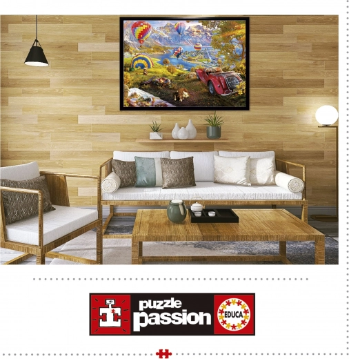Het landschap met meer, bergen en kleurrijke ballonnen, aangevuld met een rode cabriolet en een picknick, biedt rijke details die het puzzelen prettiger en sneller maken.