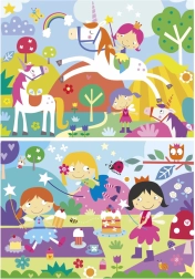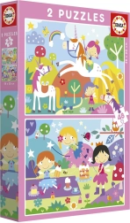 Prikkel de fantasie van kinderen met een betoverende puzzelset met het thema eenhoorns en feeën. De verpakking bevat 2 puzzels van 48 stukjes met hetzelfde formaat, ideaal om concentratie, logisch denken en fijne motoriek te trainen. De afgewerkte puzzels hebben een compact formaat van ca. 28 × 20 cm, perfect voor op een kindertafeltje.