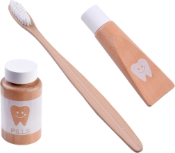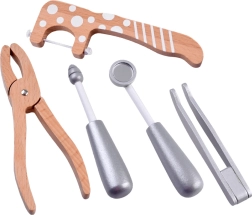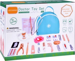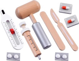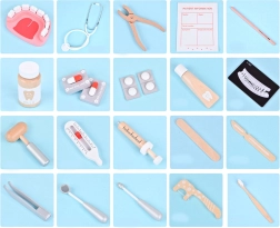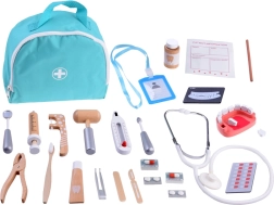 De meeste accessoires zijn gemaakt van kwalitatief hout; de stethoscoop combineert rubber, metaal en kunststof. Alles is glad afgewerkt en prettig in een kinderhand. De praktische tas (ca. 21 × 26 × 9 cm) houdt de set bij elkaar, thuis en onderweg. Let op: dit is een speelgoedartikel – het is geen echt medisch instrumentarium; stop geen tabletten of kleine onderdelen in de mond.