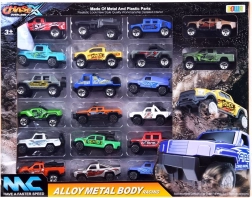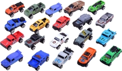 De grote set van 20 metalen autootjes maakt zowel kleine verzamelaars als raceliefhebbers blij. De modellen hebben een metalen carrosserie op een kunststof onderstel, en omvatten terreinwagens en pick-ups met gedetailleerde afwerking en opvallende graphics. Elk model is ongeveer 7,5–8 cm lang.