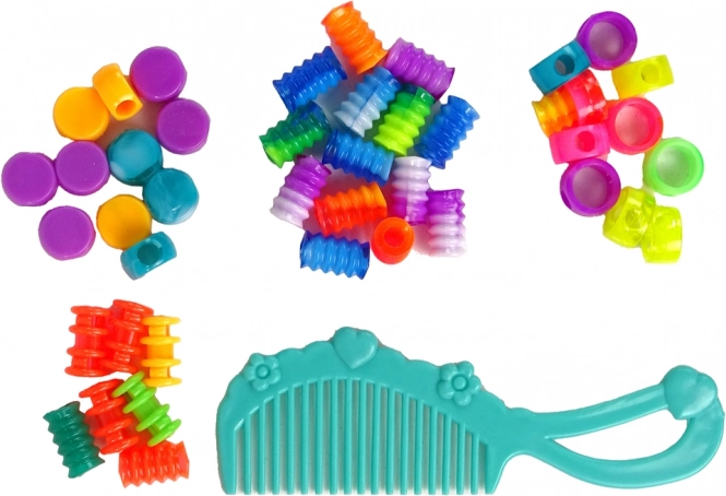 In de doos vind je een ruime selectie kralen in tinten roze, geel, paars, groen, blauw en oranje en vijf katoenen draden (groen, blauw, wit, roze, geel), elk 8 m lang. Verder een praktische blauwe kam en een gedetailleerde stap-voor-stap stylinghandleiding.