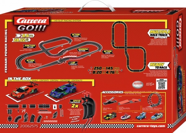 CARRERA GO Ferrari Power Racing autobaanset 8,6 m met 2 FERRARI 296 GT3-auto’s, Turbo-controllers en uitgebreide uitrusting. Eenvoudige montage, uitstekende grip, vanaf 6 jaar.