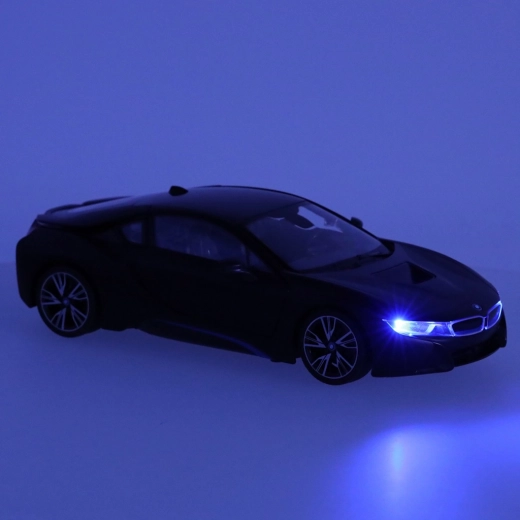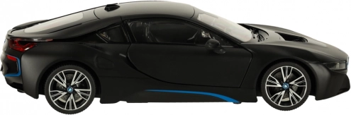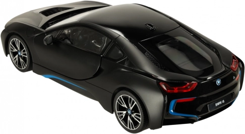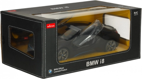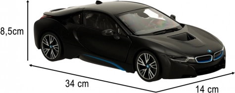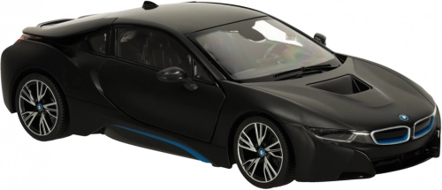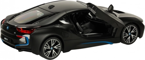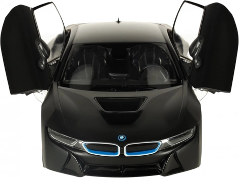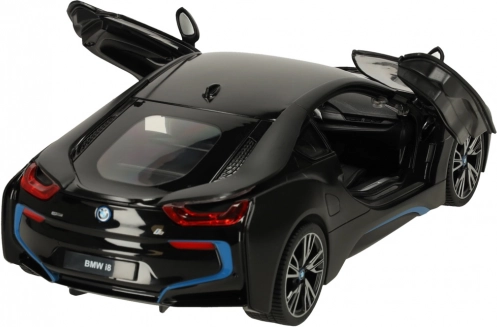 RC auto RASTAR BMW i8 1:14 in zwarte kleur met deuren die open kunnen, realistische details en eenvoudige bediening. Geweldig plezier voor kinderen vanaf 6 jaar.