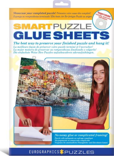 Wil je je favoriete puzzel tentoonstellen? De set EUROGRAPHICS Smart Puzzle Glue Sheets biedt een eenvoudige en schone oplossing. De zelfklevende folies houden de stukjes stevig bij elkaar en twee haakjes maken het gemakkelijk om het geheel aan de muur te hangen.