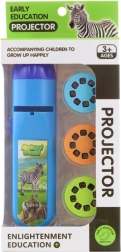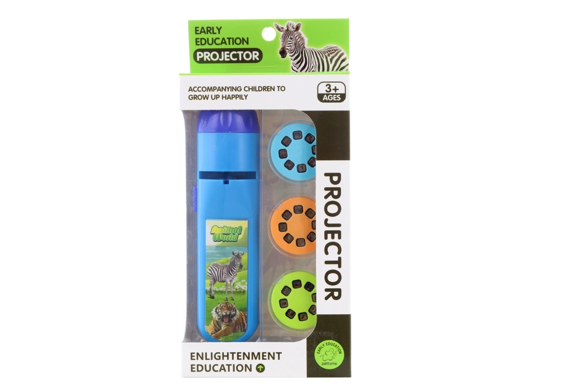 Kunststof projector op batterijen. Inclusief 3 schijven met afbeeldingen (in totaal 24 afbeeldingen). Bij het indrukken van de knop projecteert de projector de afbeeldingen op de muur (of een ander wit oppervlak). Werkt op 3 AG13-batterijen (meegeleverd). Afmetingen van de projector ca. 13 x 3,5 cm. Afmetingen van de verpakking ca. 9,5 x 20,5 x 4 cm. Leeftijd 3+.