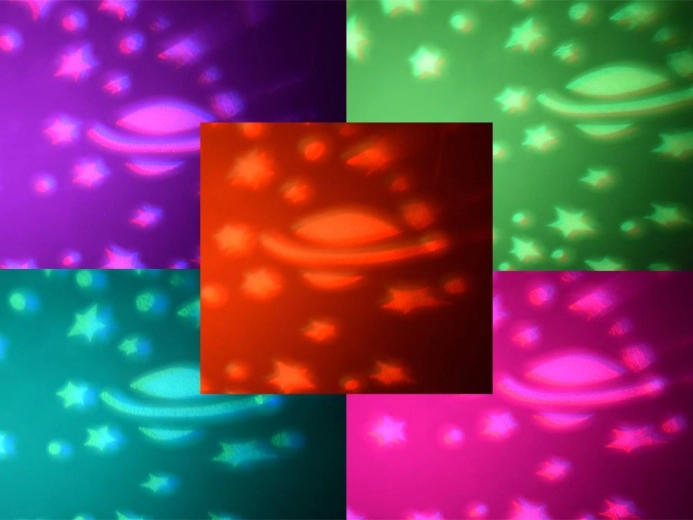 Het licht projecteert kleurrijke beelden van sterren en de maan op het plafond en de muren van de kamer, wat een rustgevende slaapomgeving creëert.
