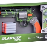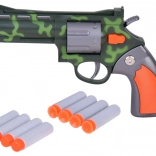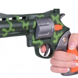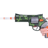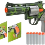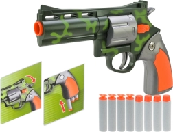 De set bevat een compact pistool met een camouflagepatroon dat comfortabel in één hand ligt. Kogels van foam en zacht rubber zorgen voor maximale veiligheid en lichtheid. De set bevat 6 kogels.