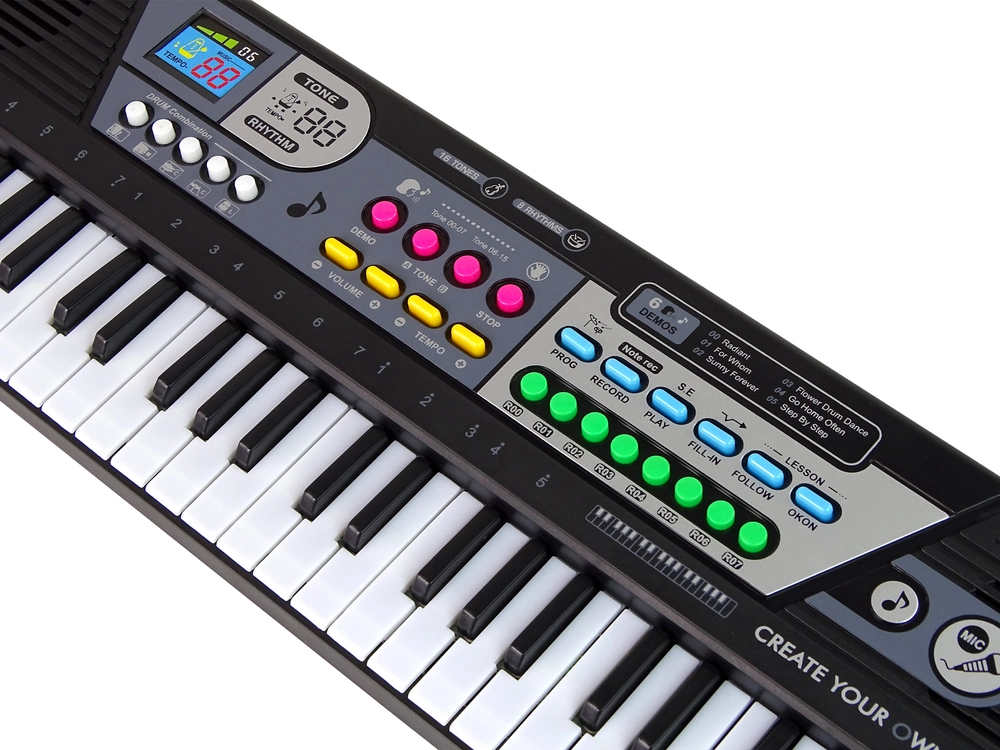 Dit keyboard heeft maar liefst 49 toetsen, wat zorgt voor eenvoudig en natuurlijk spelen. De ingebouwde microfoon maakt het mogelijk om favoriete liedjes mee te zingen, wat zeker in de smaak zal vallen bij kinderen die willen experimenteren met zang. De knoppen zijn makkelijk te bedienen en dankzij het ergonomische ontwerp is het gebruik zeer comfortabel. De lichte constructie maakt het eenvoudig om het speelgoed te verplaatsen en op een tafel of bureau te zetten, zodat je kind overal in huis kan optreden. De externe ingangsaansluiting maakt het mogelijk om naar favoriete liedjes te luisteren.