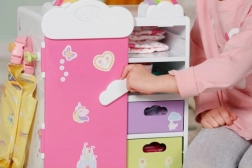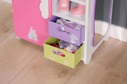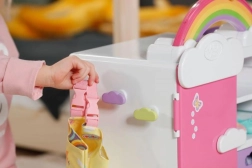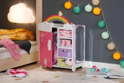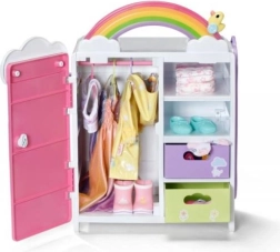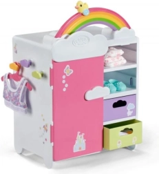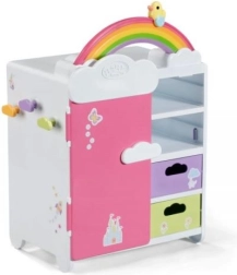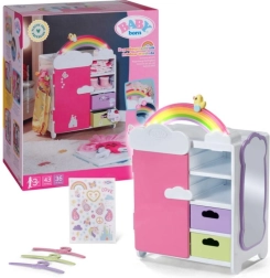 De stijlvolle kast voor BABY born poppen verandert omkleden in een magisch spel. De kleurrijke regenboog met lichtjes, vrolijke melodieën en de praktische opbergruimte met kledingroede, plankjes en lades zorgen voor orde en plezier. Aan de buitenkant zitten schattige haakjes in de vorm van wolkjes en binnenin een grote spiegel om de outfit af te stylen. Inclusief een stickervel voor creatieve personalisatie.