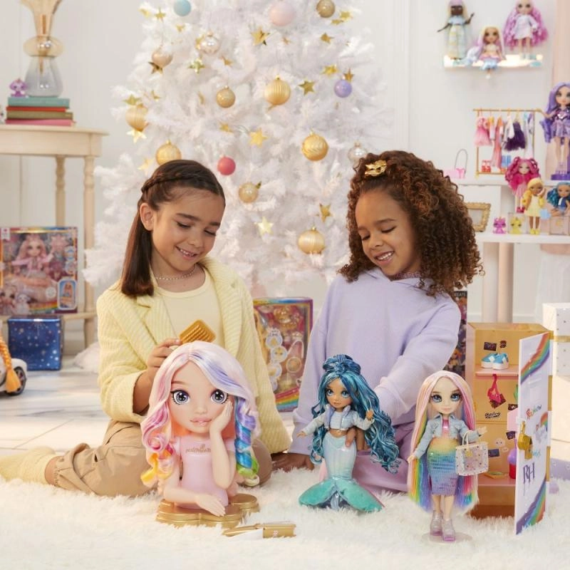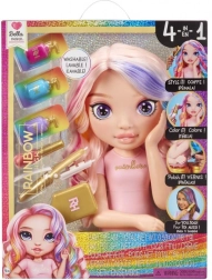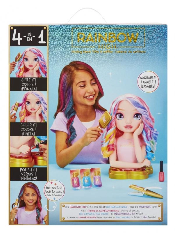Een gloednieuwe kophouder om te stylen in de look van de populairste Rainbow High-pop Belly. Je kunt highlights maken, het haar kleuren of nagels lakken.