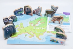 Ontdek de schoonheid van Europa met deze educatieve set houten puzzels, bestaande uit 16 stukken van de continentkaart en 10 realistisch vormgegeven dieren.