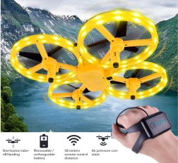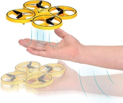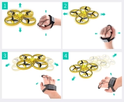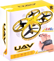 Quadcopter UAV Gravitatie Sensor - is een leuk aanbod voor kinderen en oudere kinderen die van vliegende speelgoed houden. De volledig op handen bestuurde drone is gemaakt van plastic, met fantastische LED-verlichting die geweldig in het donker te zien is. De drone wordt bediend met behulp van een speciale afstandsbediening die als een horloge om de pols wordt gedragen. Het wordt bestuurd door handgebaren, het speelgoed heeft brede manoeuvreermogelijkheden; een kleine beweging van de hand is voldoende om de richting van de vlucht te veranderen, naar rechts, naar links, omhoog en omlaag. Na het lanceren blijft hij in de lucht en draait hij rond zijn eigen as in 360 graden. De band moet stevig om de pols worden bevestigd, verstelbaar tussen de duim en voorzien van een riempje met een knop op de wijsvinger. De siliconen band heeft 12 instellingsmogelijkheden voor de breedte, zodat hij voor iedereen geschikt zal zijn. Het speelgoed is lichtgewicht, waardoor het snel opstijgt in de lucht; de 4 tegenovergestelde propellers die erin zijn gebruikt, verhogen de stabiliteit tijdens de vlucht.