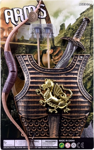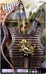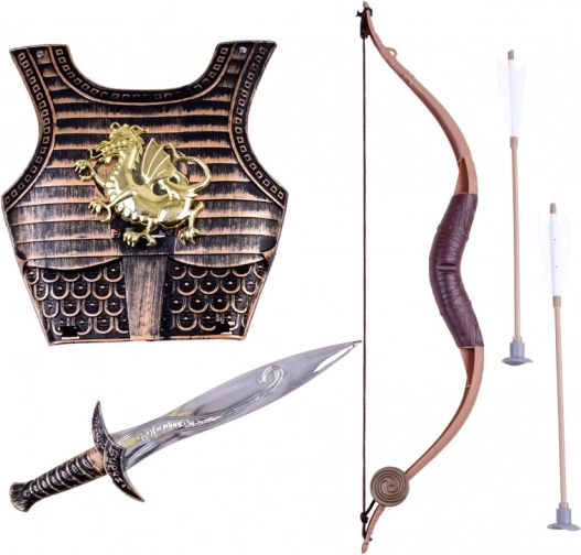 De set bevat harnas, boog, twee pijlen en een zwaard – de ideale combinatie voor fantasiegevechten en carnavalskostuums.