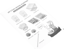 Duidelijke illustraties en instructies leiden kinderen door het hele experiment – van het mengen van de oplossing tot het plaatsen van de kiem en de groei van het kristal.
