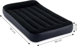 Praktisch opblaasbaar matras van INTEX voor één persoon met afmetingen 191 × 99 × 25 cm, een geïntegreerde elektrische pomp voor snel oppompen en leeglaten, een aangenaam fluweelachtig (velours) oppervlak en een duurzame Fiber-Tech/Dura-Beam-constructie. Ideaal voor thuis en op reis, met een maximale belasting van 136 kg en een gevormd hoofdkussen voor extra comfort.