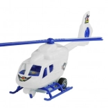 Blauw-witte helikopter, figuurtjes van bemanning en passagiers, borden, slagbomen, palmbomen en andere elementen voor een authentieke luchthavensfeer.