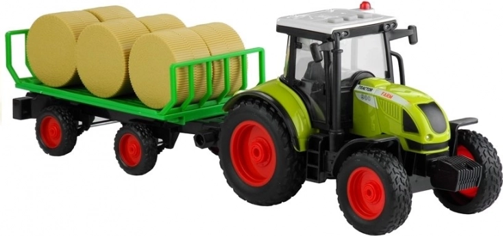 Realistische groene tractor met afneembare aanhanger en zes hooibalen voor geweldig boerderijplezier. Biedt licht- en geluidseffecten, wrijvingsaandrijving voor voorwaarts rijden en rubberen banden... Meer tonen
