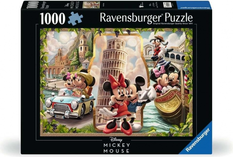 Puzzel RAVENSBURGER met 1000 stukjes met het motief Mickey en Minnie op vakantie. Precieze stans, hoogwaardig karton, afmeting na leggen ca. 70 × 50 cm.