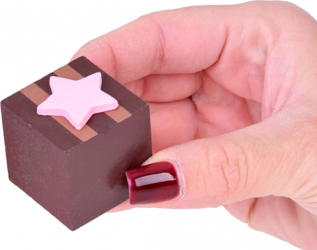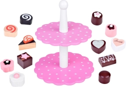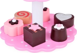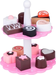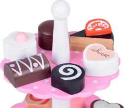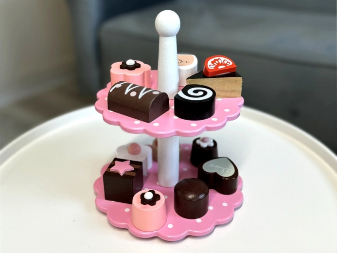 De set bevat diverse houten gebakjes en een tweelaagse standaard in zachte pastelkleuren die doen denken aan een zoete suikerwereld. Met deze set wordt elk spel een heerlijk, smakelijk avontuur.