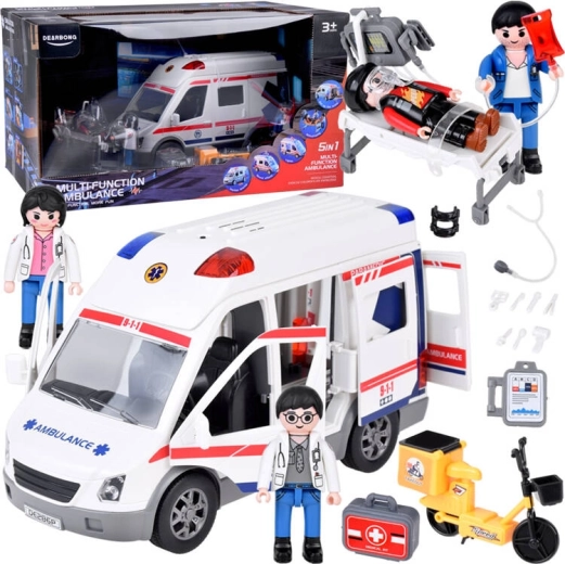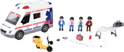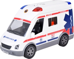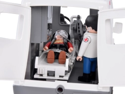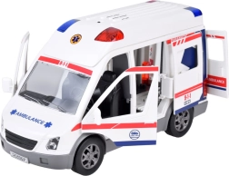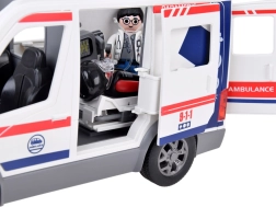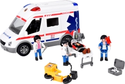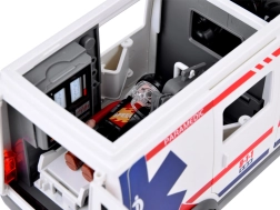 De lange ambulance is volledig van kunststof gemaakt. Het witte voertuig is precies gemarkeerd en beschreven. De ambulance heeft openende deuren naar de bestuurderscabine, waardoor het gemakkelijk is om het nauwkeurig nagebootste interieur te bewonderen. Maar dat is nog niet alles! Achterdeuren kunnen volledig openen om een patiënt gemakkelijk binnen te krijgen. Daarnaast, zijn de zijdelingse deuren aan beide zijden schuifbaar, wat het speelplezier vergroot en een gemakkelijke toegang tot de gewonde persoon in de ambulance mogelijk maakt.Â