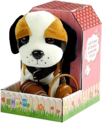 De interactieve bruin-witte Sint-Bernard aan de lijn is gemaakt van zacht en milieuvriendelijk materiaal dat prettig aanvoelt. Hij is uitgerust met grote donkere ogen, een opstaande staart en een opvallende neus. De speelgoedhond heeft een lange lijn met een schakelaar, zodat het kind zijn huisdier eenvoudig kan bedienen. De hond danst en zingt, wat het spel extra leuk en realistisch maakt.