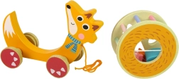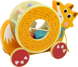 Het grote ronde element met een sorteerder en 3 houten vormen ontwikkelt nauwkeurigheid en logisch denken, terwijl de kralen rond de ring focus en visuele waarneming trainen. De blokjes binnenin rammelen zachtjes tijdens het bewegen en bieden prettige zintuiglijke feedback. Het afneembare element (trommel/ring) maakt twee spelmogelijkheden mogelijk – met de vos of apart.