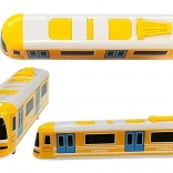 Gele en rode metrowagon met realistische ramen en het opschrift SUBWAY breiden elke kindertrein uit.