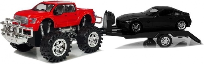 Voertuigenset rode monstertruck met aanhanger en zwarte BMW 58 cm