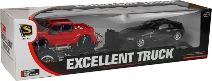 Deze waardevolle set combineert een robuuste rode monstertruck met een afneembare autotransporter-plateau en een gedetailleerde sportieve BMW. De speelgoedvoertuigen zijn gemaakt van schokbestendig plastic dat ruwere omgang aankan, ideaal voor thuisparcoursen en offroad-avonturen.