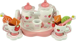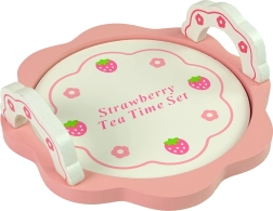 Schattig houten theeservies in wit‑roze met aardbeienmotief, ideaal voor kindertheepartijtjes. Stimuleert creativiteit, rollenspel en fijne motoriek. Bevat een dienblad met handvatten, theepot, 2 kopjes, melkkan, lepeltjes en accessoires. Veilige uitvoering van hout, duurzaam en perfect als cadeau.