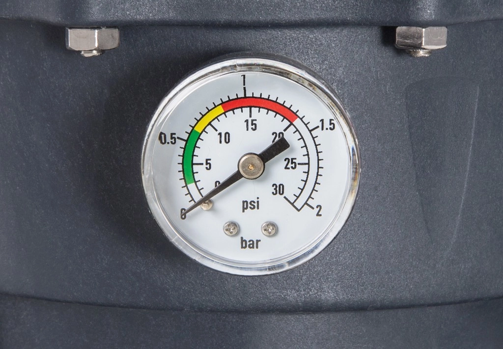 Schakel gemakkelijk tussen de standen filteren, terugspoelen, naspoelen, recirculeren, afvoeren en gesloten. De manometer toont wanneer het tijd is om terug te spoelen.