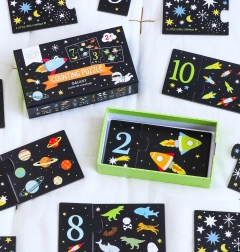 Deze educatieve puzzel met ruimtethema stimuleert tellen, logisch denken en fijne motoriek. Kinderen koppelen het cijfer aan de illustratie met het overeenkomstige aantal objecten, waardoor ze spelenderwijs basisrekenvaardigheden versterken.