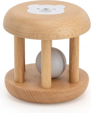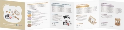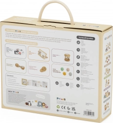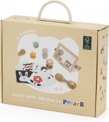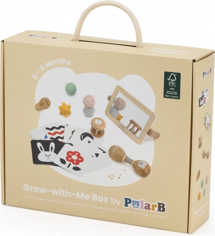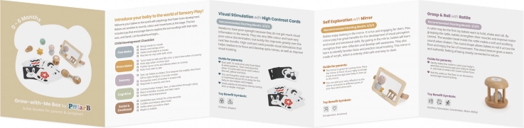 - In de doos: hoog-contrast kaarten, houten spiegeltje, rollende rammelaar, wisselschijf, dubbele maracas en een set tactiele ballen