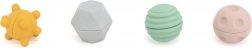Lichte, getextureerde speeltjes met verschillende oppervlakken en vormen stimuleren de tast, masseren handpalmen en vingertjes en versterken de grijpreflex. Geschikt voor fijne motoriek en de eerste hand-oogcoördinatieoefeningen.