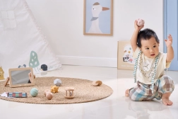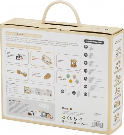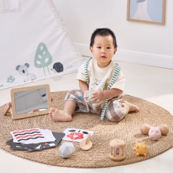 Deze zorgvuldig samengestelde set ondersteunt de natuurlijke ontwikkeling van je baby vanaf de eerste dagen. Hoog-contrast kaarten trainen fixatie en vormherkenning, het houten spiegeltje helpt bij zelfontdekking en tummy time, rammelaars en maracas ontwikkelen ritme, gehoor en coördinatie. De verschillende texturen en vormen van de tactiele ballen stimuleren de fijne en grove motoriek en versterken de greep.