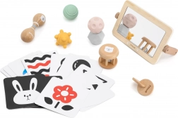 Uitgebreide sensorische set voor de allerkleinsten van 0–6 maanden, ontwikkeld om zicht, gehoor en tast te stimuleren dankzij een doordachte combinatie van materialen. Bevat hoog-contrast kaarten, een houten spiegeltje, rammelaars en tactiele balletjes van hoogwaardige materialen, inclusief FSC-gecertificeerd hout. De set is direct klaar voor gebruik en is ook perfect als cadeau.