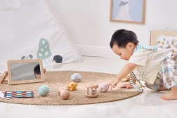 Een stevig spiegeltje met houten frame helpt tijdens tummy time, stimuleert het optillen van het hoofdje, versterkt de nek en biedt het eerste contact met de eigen reflectie. Geweldig voor de ontwikkeling van zelfbewustzijn en sociale vaardigheden.