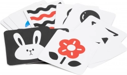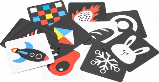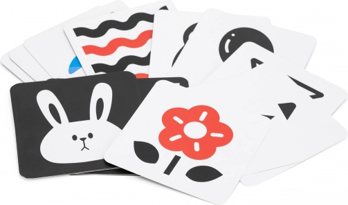 Een serie zwart-witte en rood-witte kaarten met eenvoudige vormen en afbeeldingen trekt van nature de aandacht van baby’s. Ondersteunt fixatie, het volgen van objecten en vroege visuele perceptie – ideaal voor pasgeborenen en jonge baby’s.