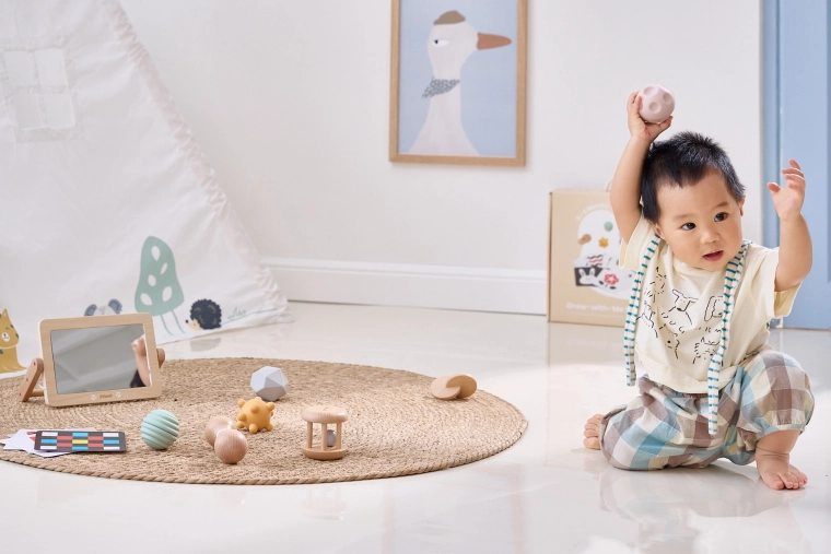 - Motoriek en coördinatie: grijpen, van hand tot hand overpakken, werken met zwaartepunt