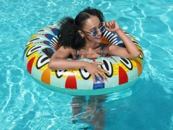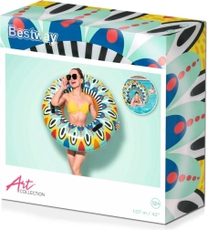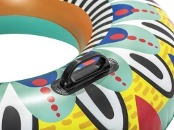 De zwemring Fiesta brengt stijl en plezier terug in het zwembad dankzij zijn levendige graphics en kleurrijke tinten. Met een diameter van 107 cm en twee zwarte handgrepen voor een stevige grip biedt hij veiligheid voor kinderen vanaf 12 jaar en volwassenen. Het geïntegreerde veiligheidsventiel zorgt voor eenvoudig opblazen en leeglaten, waardoor opbergen een fluitje van een cent is.
