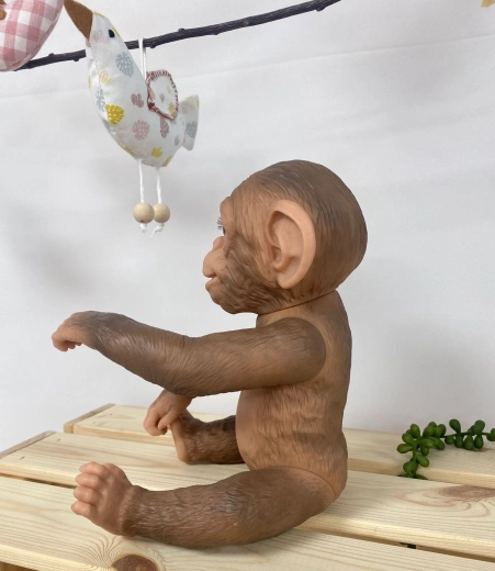 Dit realistische reborn aapje betovert met gedetailleerde afwerking van gezicht, plooitjes en de textuur van de “vacht” op het vinyl. De volledig vinyl uitvoering maakt voorzichtig badderen mogelijk (let op de wimpers), terwijl het geslacht niet is aangeduid. De ledematen zijn met gewrichten bevestigd, waardoor de speelgoedfiguur gemakkelijk poses houdt – het kan zitten, zich vasthouden of aan handen of voeten hangen.