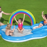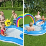 Kleurrijk kinderzwembad met regenboog en zonnetje biedt kinderen eindeloos speelplezier tijdens warme zomerdagen. Met de waterparkfunctie zorgt het dankzij de geïntegreerde attracties voor verfrissing en vrolijkheid.