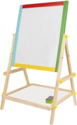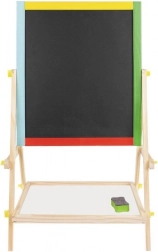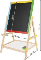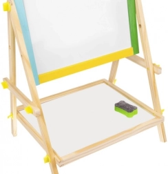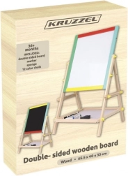 Creatief en veilig dubbelzijdig 2-in-1 bord voor kleine kunstenaars – aan de ene kant krijtbord, aan de andere kant whiteboard en magnetisch. Dankzij het draaimechanisme, de stevige houten constructie en de plank voor accessoires stimuleert het fantasie, leren en fijne motoriek. In de set zit alles voor direct plezier: krijtjes, stift en wisser.
