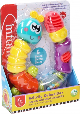Een schattige opvouwbare rammelaar in de vorm van een rups brengt kinderen vanaf 6 maanden veel plezier en ondersteunt hun ontwikkeling. Dankzij 6 koppelbare segmenten traint het de fijne motoriek, oog-handcoördinatie en stimuleert het de zintuigelijke waarneming met het rammelende geluid.