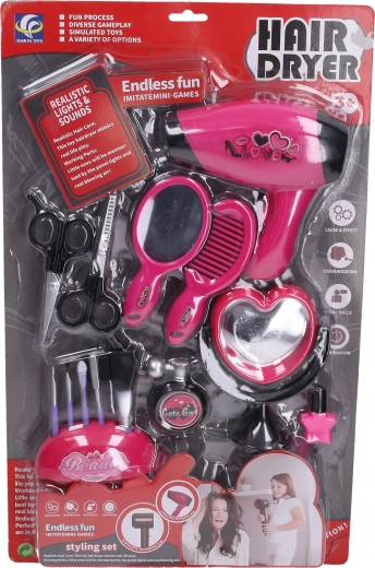 Stijlvolle cosmeticaset voor kleine beautyfans met alles wat nodig is om kappertje en make-up te spelen. De set bevat een föhn van 14 cm, een kam, een schaar, een handspiegel en staande spiegel en een kwastenset. De föhn werkt op 2× AAA-batterijen (niet inbegrepen).