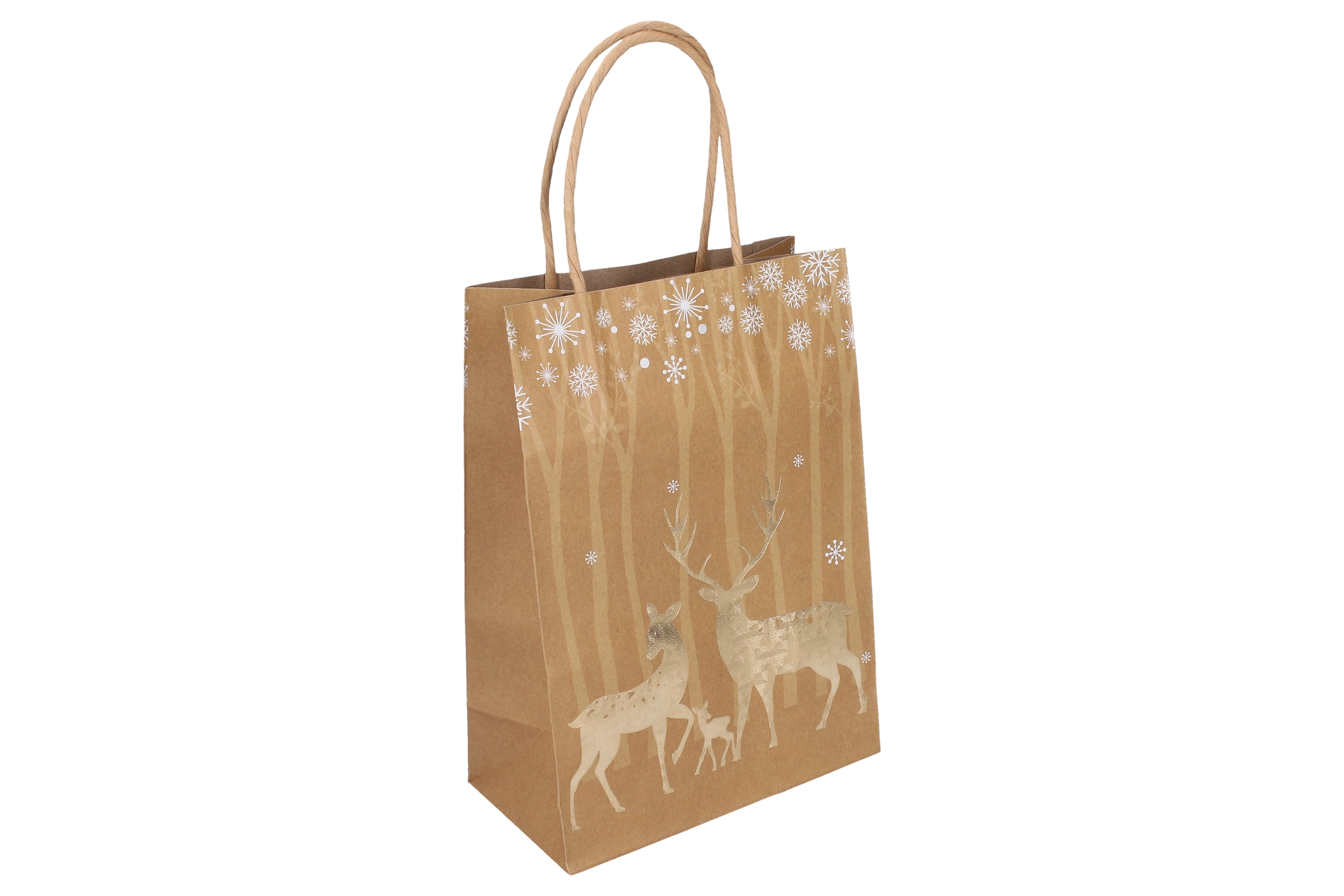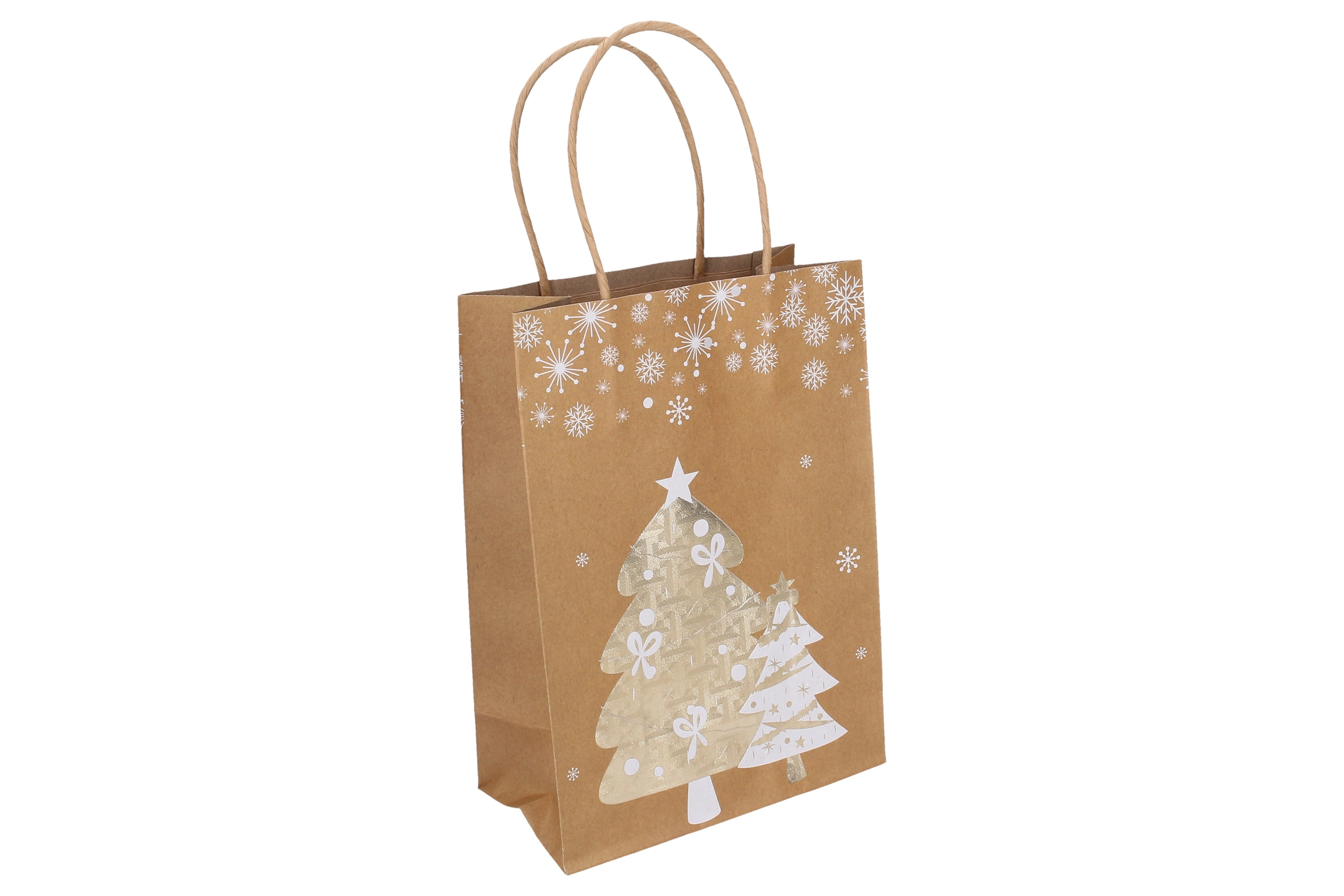 Elegante kerstcadeautas in maat S met afmetingen 15 × 21 × 8 cm, ideaal voor kleine geschenken. Biedt stijlvolle kerstmotieven, een stevige uitvoering en een praktisch handvat voor comfortabel dragen. Beschikbaar in 4 designvarianten.