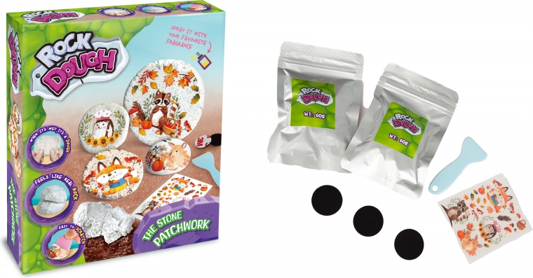 - 2× 60 g steenklei, 3× magnetische presse-papiers, stickers, schraper, geïllustreerde handleiding