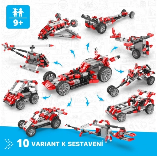• 10 modellen in één – raceauto’s, buggy’s, een helikopter en andere machines.
