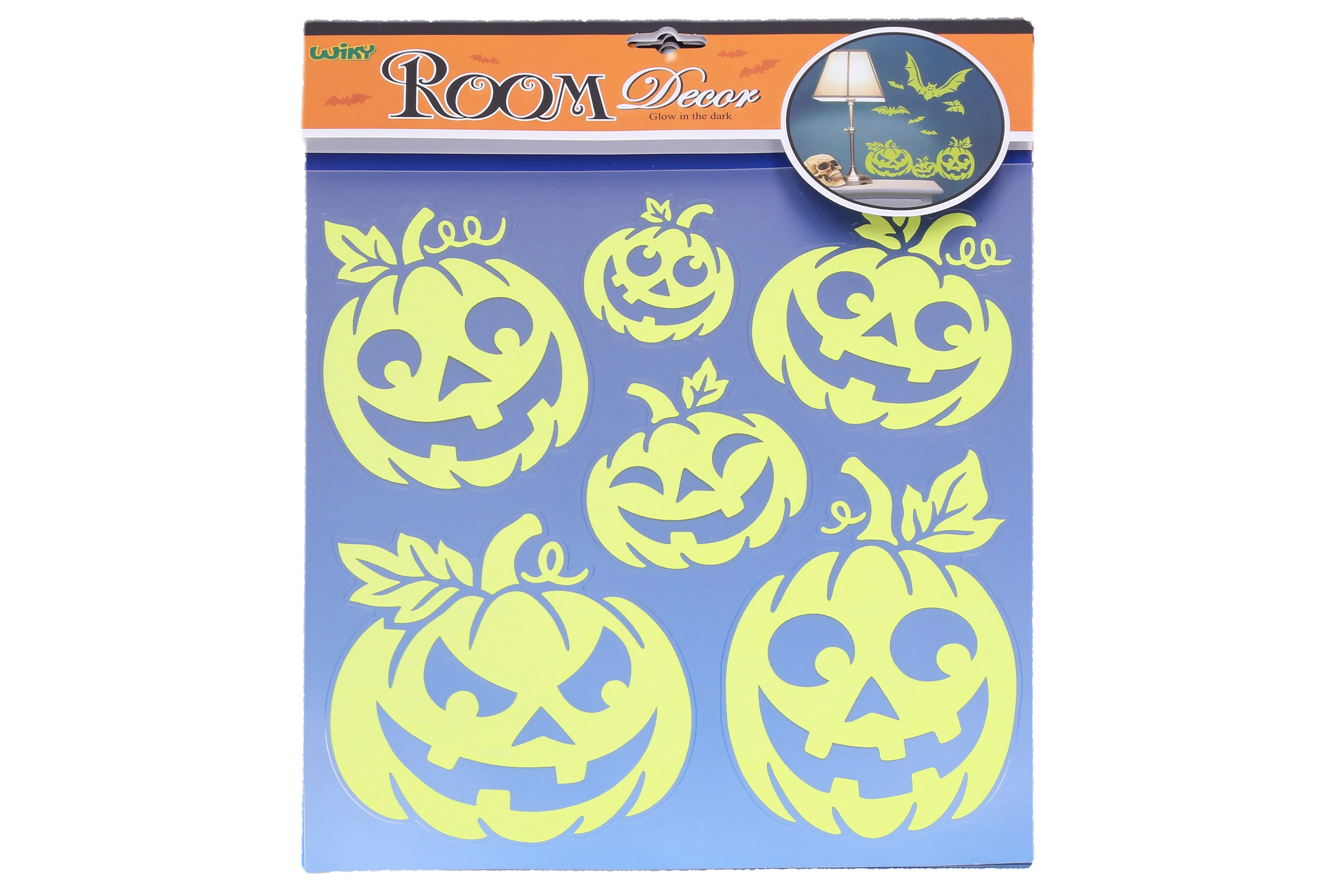 Gloeiende muurstickers met pompoenmotief voor Halloween. Eenvoudige installatie, velformaat 38 × 31 cm, gloeien in het donker na opladen met licht. Geef je interieur in een handomdraai meer sfeer.