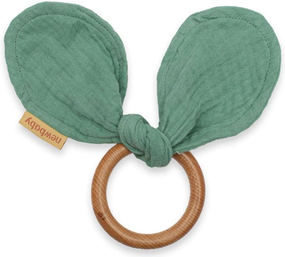 De bijtring New Baby Ears in mint kleur combineert 100% biologische katoen en beukenhout, wat zorgt voor veiligheid en natuurlijke materialen voor uw kind.